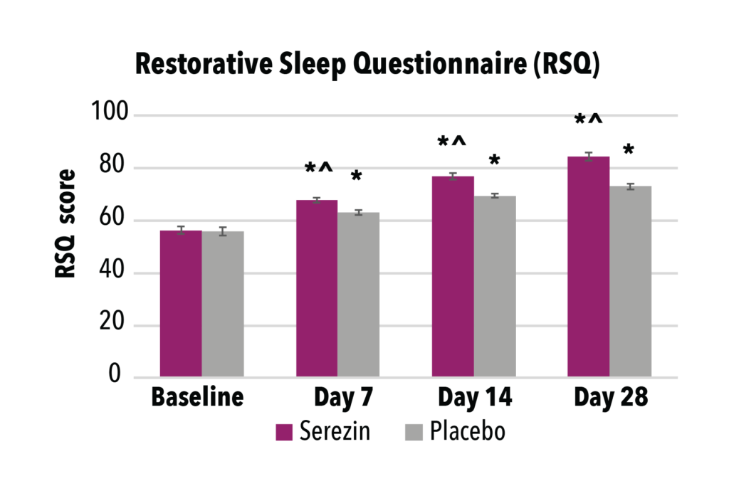 Subjects taking Serezin woke up feeling more rested and restored within the first week. By four weeks, subjects taking Serezin experienced a 64% greater improvement in restorative sleep than those taking placebo.